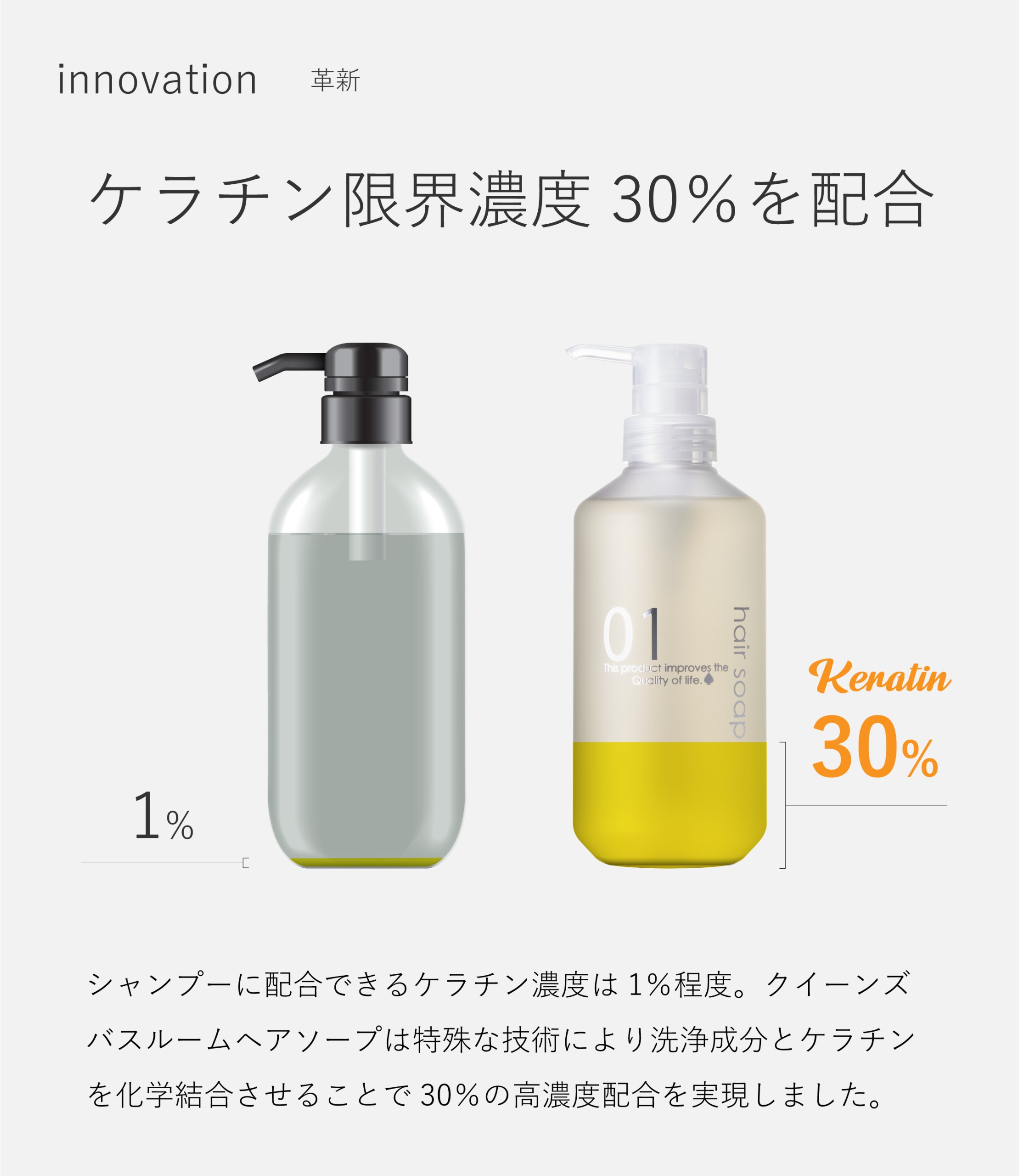 まず、ケラチンってなんなの?というお話をさせていただきます。 ケラチンというのはタンパク質の一種ですが、実は僕達の髪の毛はケラチンタンパク質というタンパク質からできているんですね。このケラチンというタンパク質なんですけどやはりですね、どんどんお年を重ねる毎に少しずつ弱っていってしまいます。そうなるとどうなるかと言いますと、髪の毛がパサつきやすくなったり、そんなに昔はクセじゃなかったのにな、みたいなうねり(くせ毛)が出てきちゃったりします。そういった方は髪の毛にケラチン入りのシャンプーでケラチンを補給することによって髪の毛にハリが出るような感じとか芯が通るような感じがしてうねりが緩和できたり、あとは髪の毛のボリュームとかも出しやすくなったりします。ですので是非皆さんケラチンというものに注目してみてください。 シャンプー紹介させていただきます。 それがですね、こちら。QUEEN’S BATHROOM(クイーンズバスルーム)ヘアソープというシャンプーです。 こちらのクイーンズバスルーム。ネットでも買えるシャンプーなんですけど、店舗は限られているんですけど全国のエステサロンや美容室でも取り扱っている、れっきとしたサロンシャンプーです。 実際に僕のサロンでも置いていてお客様に提供しているシャンプーで実際に自分たちがオススメしている物ですので自信を持って伝えていけるかなというところで選ばせて頂きました。 このシャンプー、なんで選んだかというところですけど、まず凄いのが先ほど説明した「ケラチンそのものを洗浄成分にしちゃった」シャンプーなんですよね。 こういったケラチンを洗浄成分にしているシャンプーってサロンシャンプーの中でもほとんどない位すごく珍しいものですし、ケラチン自体が原材料すごく高いのでケラチンをたくさん配合してしまうとどんどんシャンプーの値段が上がっちゃうんですけど、こちらのクイーンズバスルームはそういった部分は比較的値段も良心的かなというところで今回選ばせて頂きました。 あとは低刺激性にもすごくこだわっていて自社とかで肌の刺激テストとか行って皆さんに製品開発しているとお伺いしておりますので、実際僕も乾燥肌で合わないシャンプー多いんですけども、こちら全く問題なく使える商品になります。そういった低刺激性というところでもまずまず問題ないかなとうところです。 あとはですねこちらリニューアルしたんですけどリニューアルする前もすごく良かったんですよ。なんですけどもやっぱり「常に良いモノを作り続けるブランド」というところで信頼しているブランドですので紹介させて頂こうと思いました。 僕もこの動画を撮ったんで先ほど確認させていただいたんですけど口コミも一万件以上入ってるんですよ。結構な人気シャンプーみたいです。それだけ沢山の人からも結構高評価されてるので皆さんも良かったら参考にしてみてください。