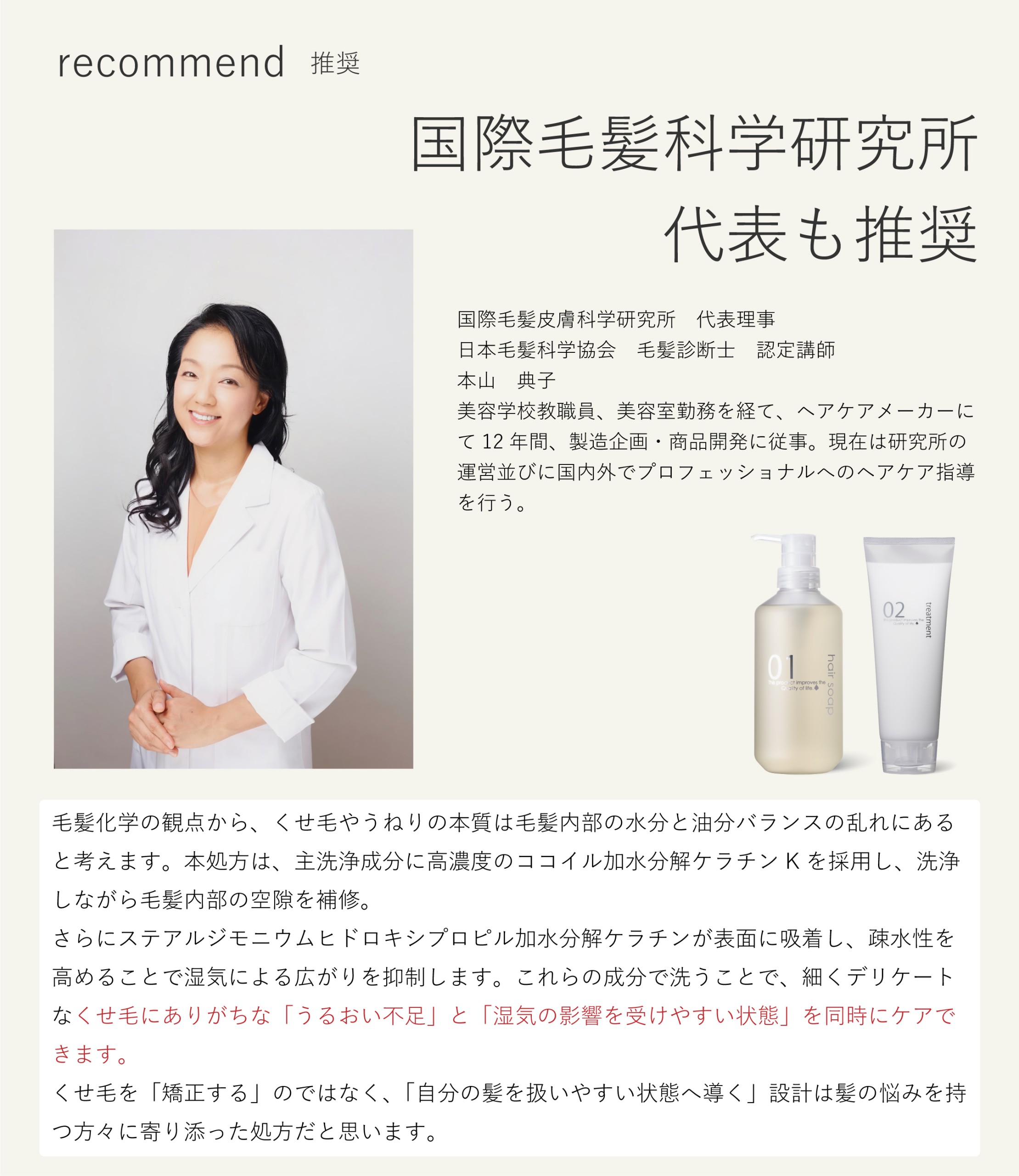 国際毛髪皮膚科学研究所 代表理事 本山典子様も毛髪科学専門家の視点からQUEEN’S BATHROOM(クイーンズバスルーム)ヘアソープ、トリートメントに配合された成分がくせ毛やうねりに対してどのような効果が期待できるか解説いただいています。