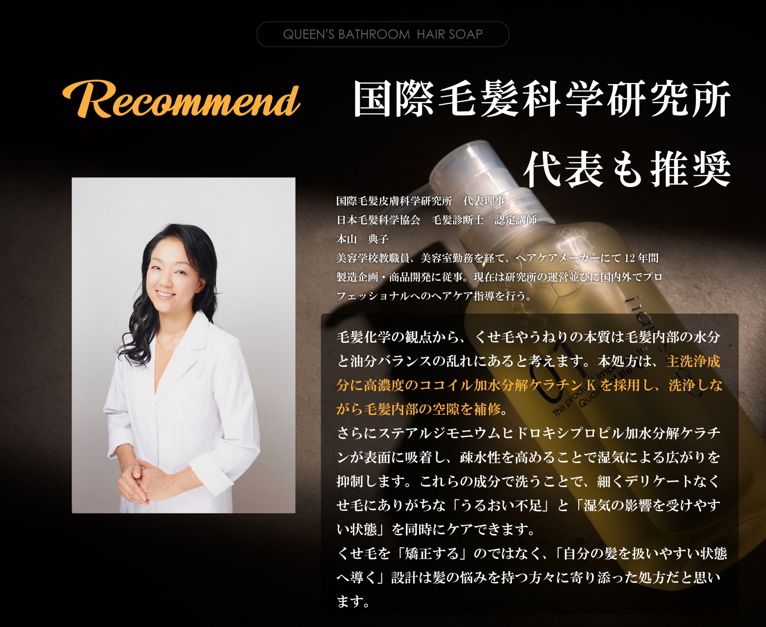 国際毛髪皮膚科学研究所 代表理事 本山典子様も毛髪科学専門家の視点からQUEEN’S BATHROOM(クイーンズバスルーム)ヘアソープ、トリートメントに配合された成分がくせ毛やうねりに対してどのような効果が期待できるか解説いただいています。