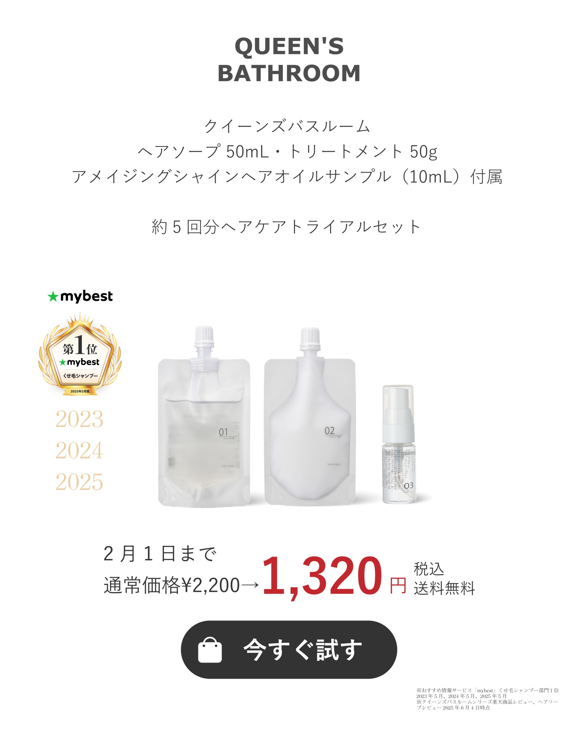 【高濃度ケラチンシャンプーでくせ毛を変える。】 クイーンズバスルーム ヘアケアトライアルセット。 肌や髪のタンパク質の90%以上を構成する「ケラチンタンパク質」から生成された高級洗浄成分※ココイル加水分解ケラチンKを限界濃度まで贅沢に配合した、ケラチンシャンプー、トリートメントに、インバスウェットコームが付属したお試しトライアルセット。 髪はケラチンタンパク質が均一で密に存在することによって、美しいツヤと強さ、しなやかさをもっていますが、年齢に伴い、髪の主成分であるケラチンは徐々に減少してしまいます。 ケラチンが減少し、不均一になった髪はクセやうねりが生じ、ハリとコシも失われてゆきます。 また、髪の水分保持力も低下するためパサついた、見た目にもエイジングを感じる髪へと変化してゆきます。 クイーンズバスルーム ヘアソープ(シャンプー)は、シャンプーの中にケラチン分子を配合する従来の方法とは異なる、ケラチン自体から作られた画期的な洗浄成分を高濃度に配合しているため、洗浄成分と化学的に結合した低分子ケラチンが毛組織の内部まで浸透。加齢や洗浄力の強いシャンプーなどによるダメージで失われたケラチンたんぱく質の空洞部に、ただ洗うだけでケラチンを効果的に髪へと補給します。 また肌や髪と同じケラチンタンパク質の洗浄成分のため、ケラチンシャンプーはくせ毛やダメージに適しているだけでなく、肌や髪にやさしいシャンプーと言えます。 クイーンズバスルーム トリートメントには加水分解ケラチン、加水分解コメタンパク、2種のタンパク質を贅沢に配合。ヘアソープに配合されたココイル加水分解ケラチンが髪の内部を浸透補修するのに対し、トリートメントに配合された2種のタンパク質は髪表面のよりダメージの高い部分に吸着して補修します。